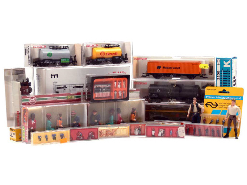 comprend : 8 wagons de marchandises (dont 2 regroupés avec un véhicule dans un coffret), 9 boîtes de figurines & une boîte de 10 rails droits - on y retrouve les marques : FLEISCHMANN, MÄRKLIN & PREISER - on y joint 2 boîtes de 8 figurines de la marque L.G.B. & 2 personnages 'GUERRES DES ETOILES'
