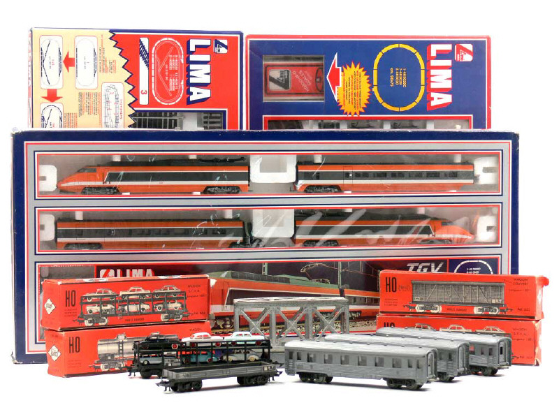 comprend : un coffret de rames à 4 éléments de TGV avec transformateur & rails, un coffret de train de voyageurs comprenant une motrice, 2 voitures de voyageurs, un transformateur, notice, rails & un coffret de divers rails supplémentaires