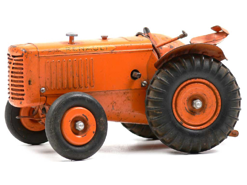 longueur 19,5 cm - moteur à clef (fonctionne de manière aléatoire) - version de 1952, sans conducteur, avec décalques RENAULT sur le capot - manque poulie latérale, une vis de capot-moteur, phares & bouchon de radiateur - volant désolidarisé de la colonne de direction (tordue) - une extrémité d'aile & calandre déformées