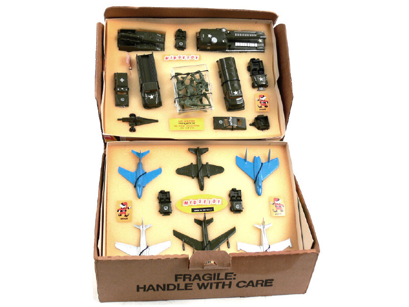 contient : 4 JEEP, 2 camions, 2 voitures, 2 chars, un canon, une remorque, une voiture d'état-major, une ambulance, 6 figurines & 6 avions - éléments présentés ficelés sur mousses de protection & sur 2 niveaux - avec notice du contenu - SUPERBE !