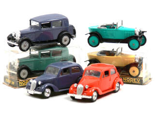 comprend : CITROEN 5 HP (2 exemplaires dont un avec boîte & bulletin d'inscription au 'CLUB NOREV'), PEUGEOT 201 (2 exemplaires dont un avec boîte & bulletin d'inscription au 'CLUB NOREV'), SIMCA 1200 (2 exemplaires) - quelques petites déformations sur certaines carrosseries