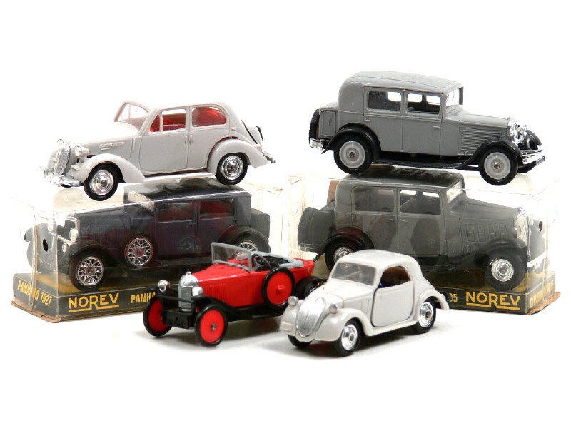 comprend : CITROEN 5 HP, PEUGEOT 201, SIMCA 1200, SIMCA 5, CITROEN ROSALIE (avec boîte & bulletin d'inscription au 'CLUB NOREV') & PANHARD 1927 (avec boîte & bulletin d'inscription au 'CLUB NOREV') - quelques petites déformations sur certaines carrosseries