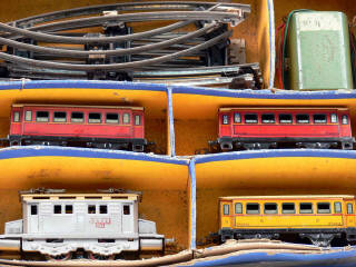 états de 'B' à 'C' - contient : une motrice électrique de type boîte à sel 'SNCF' (traces d'oxydation sur les pantographes, une cale de châssis rajouté), 2 voitures-voyageurs de première classe, une voiture-voyageurs de 2ème classe, 5 rails courbes, 4 rails droits & un transformateur n°0 - quelques traces d'oxydation & parties tachées