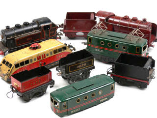 états de 'B' à 'F' - comprend : 2 locomotives à vapeur type 020 dont une avec tender, une motrice mécanique type 8051 (moteur à clef fonctionne), un autorail électrique à un élément 'ETAT', 4 tenders & une carrosserie de motrice BB 8051 mécanique - traces d'oxydation - quelques transformations & parties repeintes