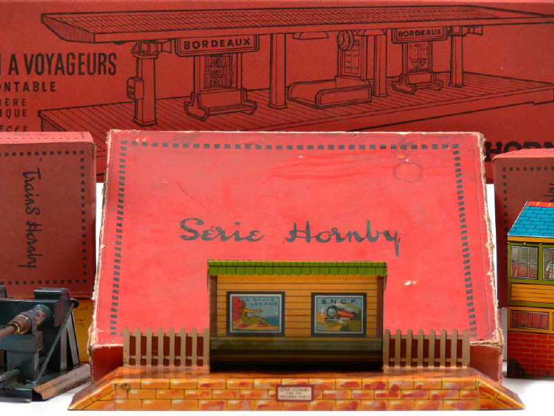 comprend : un abri de quai en tôle lithographiée (sans boîte), une façade de poste sémaphorique en tôle lithographiée (sans boîte), un quai à voyageurs démontable, une plaque tournante n°1, 2 heurtoirs n°1 & un heurtoir n°2 (en état 'D', sans boîte) - semble complet