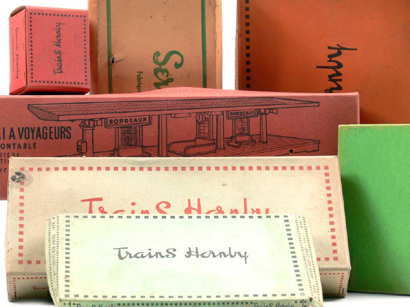 comprend : un quai à voyageurs démontable (importantes traces de poussière & modifications électriques), un contrôleur de vitesse (avec notice & carton de protection), un croisement oblique mécanique (avec ses broches sous papier jamais utilisées), un heurtoir n°1 (en état 'C' & modifié), 3 aiguillages électriques talonnables, une paire d'aiguillages électriques (avec traces d'oxydation & boîte en état 'c') & un croisement oblique électrique avec broches sous papier jamais utilisées (avec boîte en état 'c') - semble complet