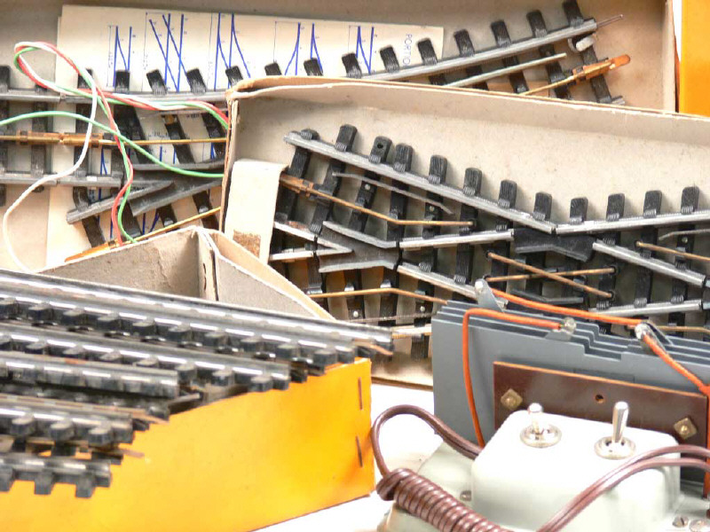 comprend : une boîte de 12 rails droits type 'DEO' (3 exemplaires avec traces d'oxydation) avec fiche de contrôle, un aiguillage électromécanique référence ADE-60 avec notice & fiche de garantie, un croisement électrique référence XOE-0 & une cellule redresseuse référence 60-3 A avec notice & fiche de garantie - quelques parties nickelées des rails ternies