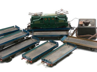 traces d'oxydation - carrosserie poussiéreuse - on y joint un transformateur référence 761, 3 wagons-plateaux de la marque & 5 autres de marques indéterminées tous transformés