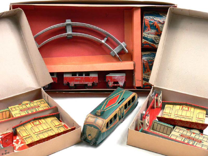 contient : une locomotive à vapeur type 020 (moteur à ressort fonctionne) avec tender, une voiture de voyageurs, 3 rails courbes & un tunnel - avec calage de boîte - on y joint 2 boîtes 'ACCESSOIRES 8 BIS' contenant chacun 2 façades de gare, 2 signaux & un passage à niveau en tôle lithographiée (en état 'A.b') & un autorail 'ECLAIR' à un élément (en état 'D') avec moteur à clef (non d'origine fonctionne)