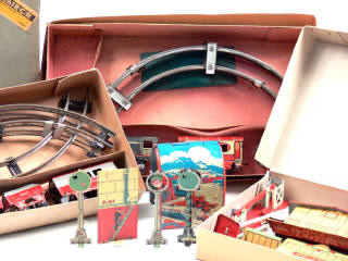 contient : une locomotive à vapeur type 020 (moteur à ressort fonctionne) avec tender, une voiture de voyageurs & 3 rails courbes - avec calage de boîte - on y joint un boîte 'ACCESSOIRES 8 BIS' contenant 2 façades de gare, 2 signaux & un passage à niveau en tôle lithographiée (en état 'A.b') & un ensemble de 5 éléments en tôle lithographiée