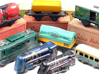 états de 'B' à 'D' - comprend : une motrice électrique type BB 8051, un wagon-foudre double, un wagon-benne basculante n°1, un wagon-fourgon n°I-S & un wagon bâché 'SAINT-FRERES' - 4 éléments avec boîtes - on y joint 2 locomotives à vapeur type 020 & une voiture PULLMAN de la marque JEP - quelques traces d'oxydation