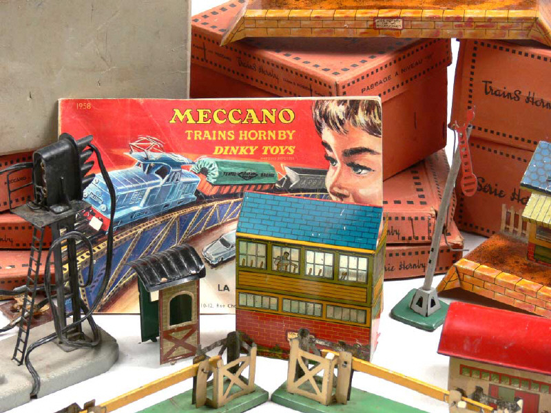 états de 'B' à 'D' - comprend : une cabine sémaphorique, un passage à niveau type M, 2 croisements obliques mécaniques, 2 heurtoirs n°1, un signal de voie électrique, une petite gare en tôle lithographiée, un quai de gare avec abri en tôle lithographiée, un signal disque (manque disque), un poste d'aiguillage en tôle lithographiée & 4 éléments de marque indéterminée - 7 éléments avec boîte dont une incomplète - on y joint un catalogue général MECCANO de 1958 avec sa fiche de tarifs