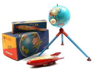 hauteur 28 cm - moteur à clef (fonctionne) - en action, le globe tourne tandis que la force centrifuge fait s'éloigner le satellite de la planète - une ventouse de trépied séchée & cassée - modèle fabriqué par JOUSTRA sous licence GAMA