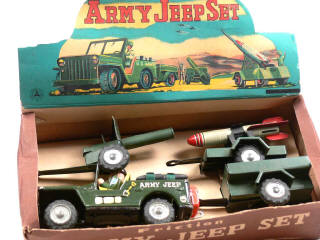 longueur de la jeep 14 cm -moteur à friction (fonctionne) - avec bruiteur - contient : une ARMY JEEP, un canon tracté, une remorque pick-up & une autre avec fusée - avec cale de boîte - BEL ENSEMBLE !