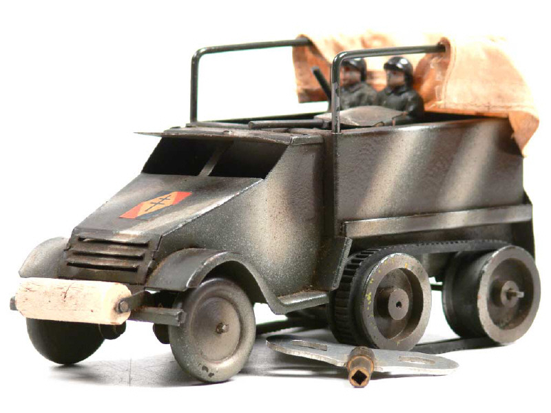 longueur 17,5 cm - moteur à clef (fonctionne) - avec la Croix de Lorraine sur le capot, direction, clef, 2 soldats en composition, bâche en tissu (tachée) & système de pierre à briquet (à revoir) - chenilles non d'origine - un pignon oxydé