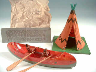 longueur 25 cm - bateau & pagaies en bois (une rame cassée) - figurines en composition