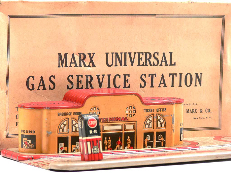 MARX TOYS (USA) Gare de marchandises 'UNION STATION' en tôle lithographiée gris, rouge & ocre