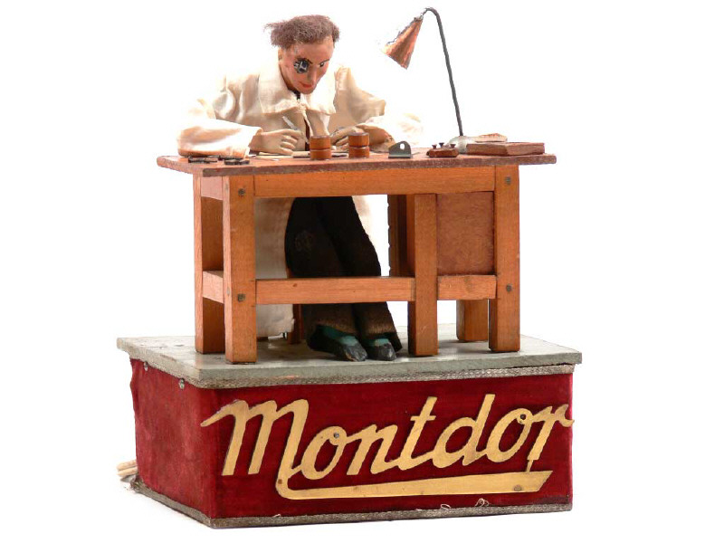 dimensions : 14,5 x 12 x 19 - réalisation essentiellement en bois - moteur électrique fonctionne sur secteur (220 V) - en action, le personnage lève puis baisse les bras & la tête tout en étant penché au dessus de sa table de travail - sur socle avec publicité 'MONTDOR' fixée sur la base - il s'agit vraisemblablement d'un objet publicitaire réalisé pour les horlogers-bijoutiers dépositaires de cette marque - TRES BELLE REALISATION !