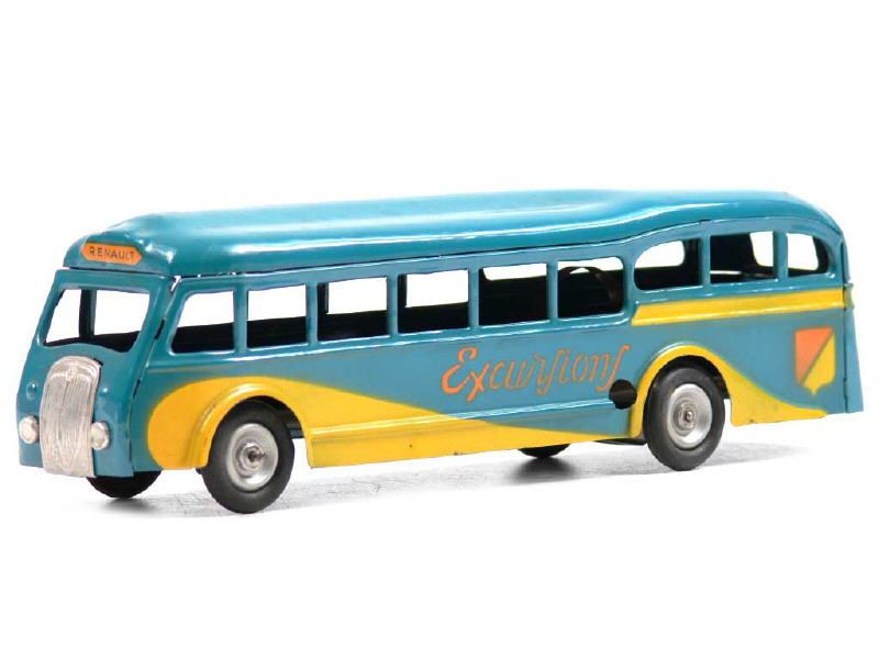 longueur 23 cm - moteur à clef (fonctionne) - version de 1939, avec calandre pleine & inscriptions 'PULLMAN RENAULT' & 'EXCURSIONS' au pochoir - avec direction (un léger défaut d'origine de positionnement du support) - SUPERBE !