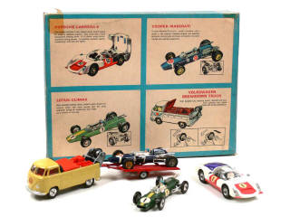 contient : un VOLKSWAGEN pick-up de dépannage, une remorque-plateau, une PORSCHE CARRERA 6, une LOTUS CLIMAX F1 (en état 'B' avec pneus non d'origine), une COOPER- MASERATI F1, un sachet de 15 cônes & 2 planches d'autocollants de numéros de compétition - boîte en partie décolorée