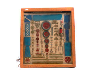 dimensions : 71x 56 x 52 cm - comprend 5 tiroirs permettant le rangement des pièces - avec panneau de présentation comprenant des pièces ficelées, vitre & panonceau de fronton - contient un ensemble important de pièces détachées & visserie (dont une partie sous emballage jamais ouvert) - avec câblage électrique d'éclairage (non testé)