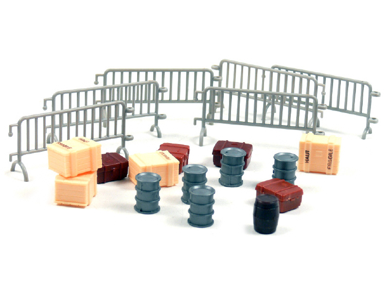 comprend : 6 barrières, 4 caisses, 4 valises, un tonneau & 5 fûts