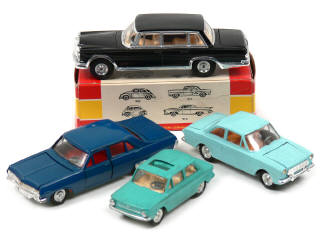 miniatures reproduisant les modèles : FORD, MERCEDES (en boîte 'c'), OPEL & NSU (peinture légèrement encrassée)