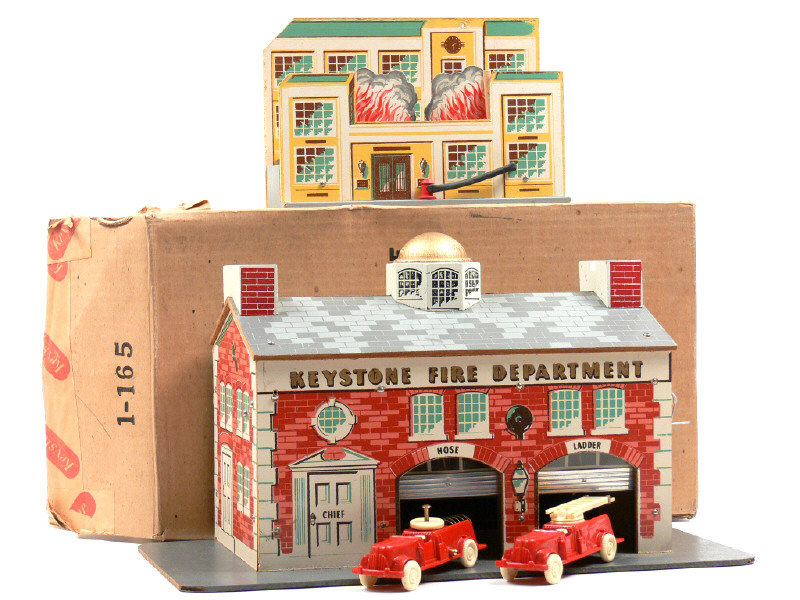 dimensions : 41,5 x 24 x 23 cm - fabrication de la fin des années 30 & début des années 40 - réalisation en bois & isorel avec système de portes coulissantes commandé par manivelle (avec sonnerie) & mécanisme d'éjection des véhicules du bâtiment par poussoirs à ressort - comprend : un camion grande échelle de pompiers, un camion autopompe (avec système fonctionnel) & un bloc d'immeuble avec parties mobiles simulant un incendie - avec calage de boîte & papier d'emballage d'origine - SUPERBE ENSEMBLE DANS UN ETAT EXCEPTIONNEL !