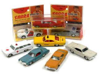série 'SABRA' - états de 'A' à 'B' - comprend : CADILLAC ELDORADO, OLDSMOBILE TORONADO, PONTIAC GTO, CHEVROLET IMPALA, PONTIAC FIREBIRD, FORD GT, CHEVROLET TAXI & CHEVROLET CHEVELLE ambulance - 3 modèles avec boîte dont une avec carton de présentation manquant