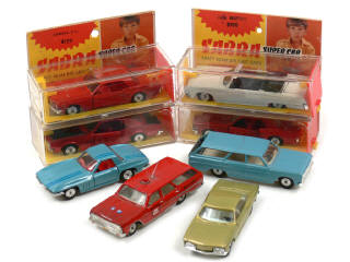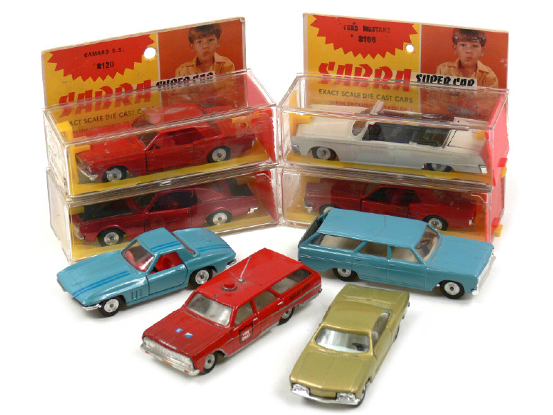 série 'SABRA' - états de 'A' à 'B' - comprend : FORD MUSTANG (2 exemplaires), CHEVROLET CAMARO SS, CHRYSLER IMPERIAL, CHEVROLET CORVAIR, CHEVROLET CORVETTE STINGWRAY, CHEVROLET CHEVELLE STATION WAGON & CHEVROLET CHEVELLE 'FIRE CHIEF' (modèle transformé avec retouches & détails de peinture ajoutés) - 4 véhicules avec boîte dont une avec carton de présentation manquant