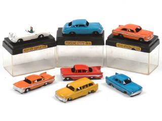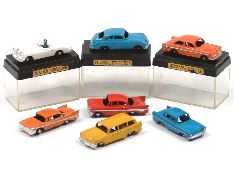 états de 'A' à 'C' - échelle 'HO' - miniatures reproduisant les modèles : VOLVO, PORSCHE, JAGUAR, FORD, PLYMOUTH & CHRYLER - 3 voitures avec boîtes-vitrines