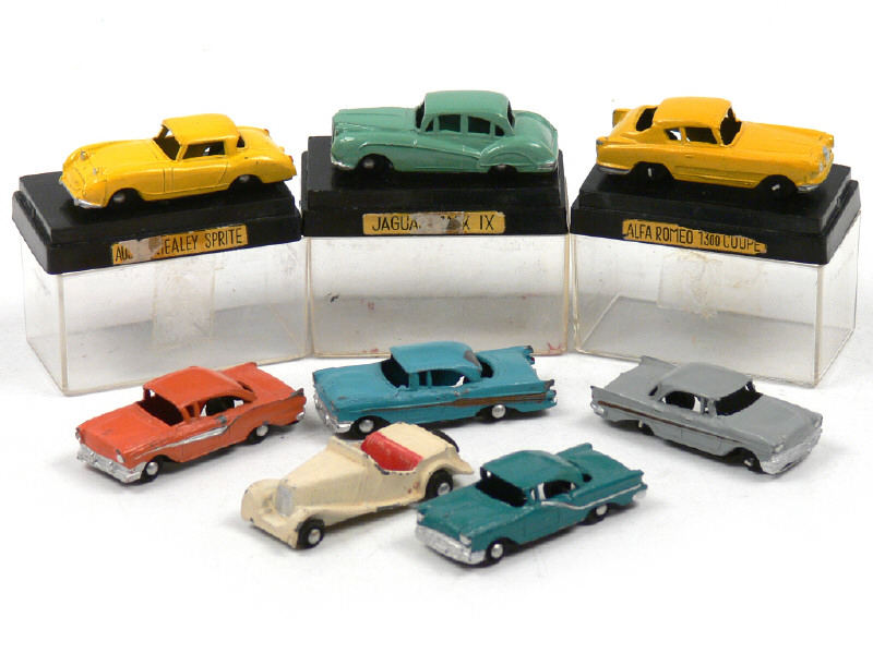 états de 'A' à 'D' - échelle 'HO' - miniatures reproduisant les modèles : JAGUAR, ALFA ROMEO, AUSTIN HEALEY, OLDSMOBILE, RAMBLER, FORD, PONTIAC & MG - 3 voitures avec boîtes-vitrines