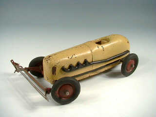 longueur 30 cm - moteur électrique (non testé) - manque pilote & insigne de capot - ce véhicule en tôle peinte faisait partie d'un ensemble eu égard à sa barre de direction contrôlant la trajectoire - le décalque sur le plancher mentionne une fabrication de KOKOMO dans l'INDIANA