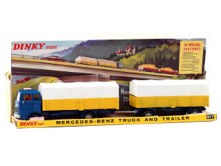 DINKY TOYS (GB) 917 MERCEDES Bâché avec remorque bâchée bleu foncé & jaune, bâches blanches