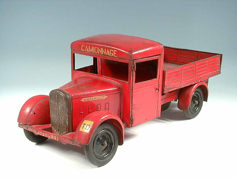 longueur 42 cm - moteur mécanique à clef (fonctionne) - mentions 'CAMIONNAGE' sur le fronton de la cabine & 'TD' sur l'aile avant gauche - manque phares & attaches de direction - moteur avec fixation refaite - traces d'oxydation