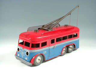 JOUSTRA (FRANCE) 442A Trolleybus mécanique en tôle lithographiée rouge & bleu