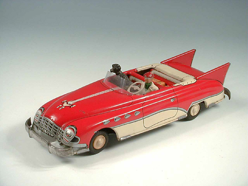 longueur 29 cm - moteur à friction (fonctionne) - avec conducteur, chien & bagages sur le siège arrière