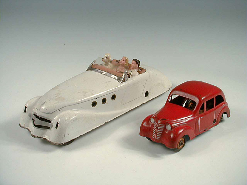 longueur 23 cm - moteur mécanique (fonctionne) - version de 1954, avec deux personnages & un caniche - plexiglas du pare-brise non d'origine - manque les phares rapportés - retouches de blanc