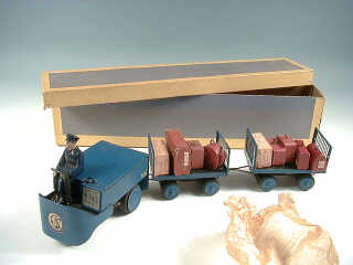 longueur 42 cm - moteur à clef (fonctionne) - fabrication en bois & tôle peinte - personnage en fonte d'aluminium - avec neuf bagages d'origine - ETAT EXCEPTIONNEL !