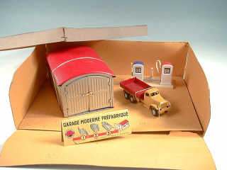 comprend : un garage démontable en tôle, un poste de ravitaillement (manque enseigne) & un GMC benne-basculante FRANCE JOUETS (B) - la petite notice cartonnée indique le montage du garage - ensemble jamais utilisé !