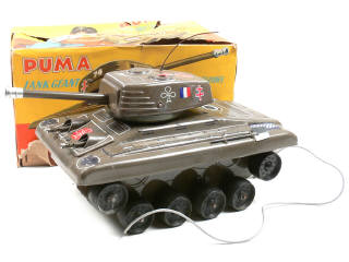 longueur 39 cm - moteur à piles (non testé) - avec mécanisme de pierre à briquet (a revoir) & canon permettant de tirer des billes - chenilles cassées - boîtier à piles incomplet