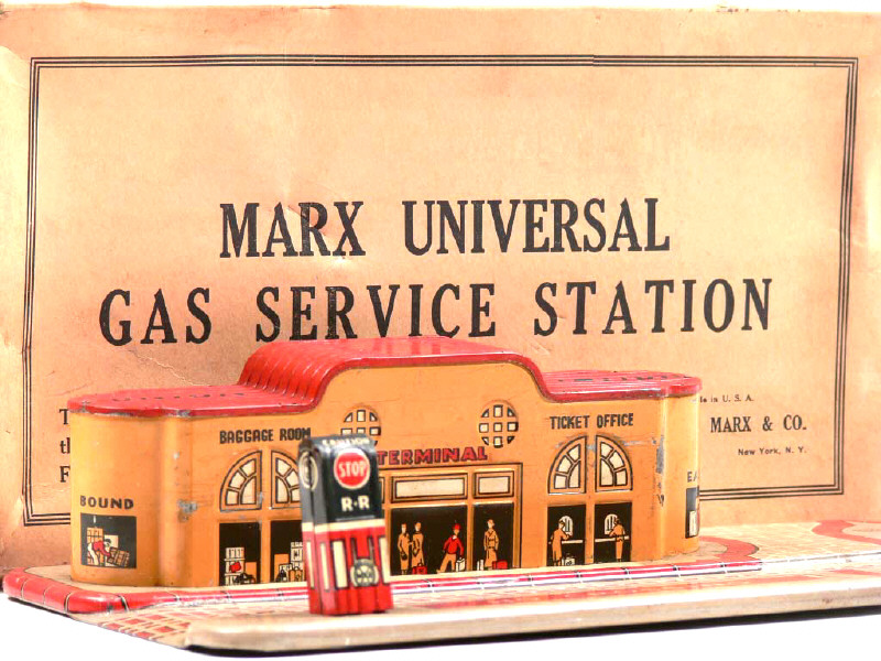 MARX TOYS (USA) Gare de marchandises 'UNION STATION' en tôle lithographiée gris, rouge & ocre