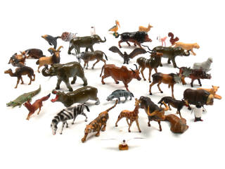 comprend notamment : un tigre, des éléphants, une girafe, un hippopotame, un renard, un dromadaire, un crocodile, un pélican, un dauphin, etc...- manque une patte sur un élan