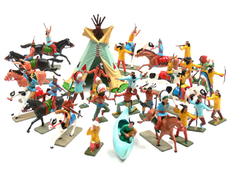 comprend : 11 cavaliers, 17 indiens à pied (dont un une crosse de fusil cassée) & une squaw - on y joint un tipi & un canoë