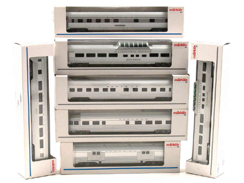 MÄRKLIN 'HO' (ALLEMAGNE) Ensemble de 6 voitures de voyageurs & un fourgon à bagages 'SANTA FEE' gris métal
