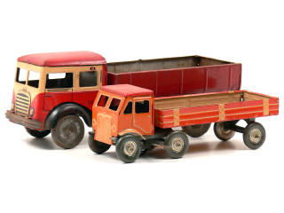 longueur 30 cm - avec direction - moteur à ressort (à revoir) - traces d'oxydation essentiellement à l'intérieur de la benne