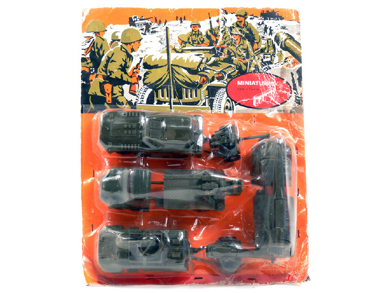 comprend : BERLIET porte-canons antiaériens, BERLIET lance-fusée, COMBAT CAR avec canon tracté & véhicule blindé avec canon tracté - sous blister jamais ouvert