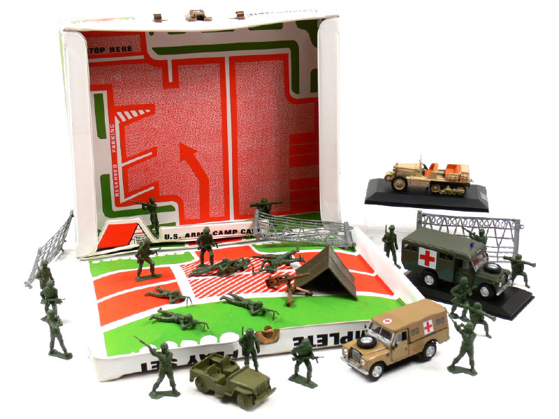dimensions : 35 x 30 x 9,5 cm - valise plastifiée faisant office de camp militaire - contient une JEEP, une tente, une mitrailleuse, 3 barrières de barbelés & 24 soldats en plastique - on y joint 2 LAND ROVER & une CITROËN KEGRESSE de la marque HONGWELL