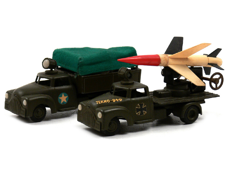 version avec projecteur directionnel sur le toit de la cabine & marquages latéraux 'TEKNO - 949' sur le capot-moteur - décalques de portière non d'origine - missile cassé & recollé - manque une fixation de plateau