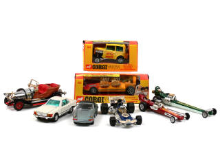 états de 'A' à 'B' - comprend : 4 dragsters (dont 2 avec boîte), CHITTY CHITTY BANG BANG (manque personnages & voilures amovibles), MERCEDES 350 SL, PORSCHE 911 S TARGA & SURTESS TS9